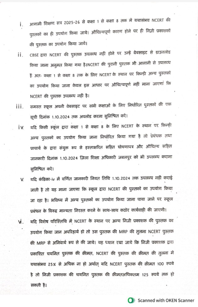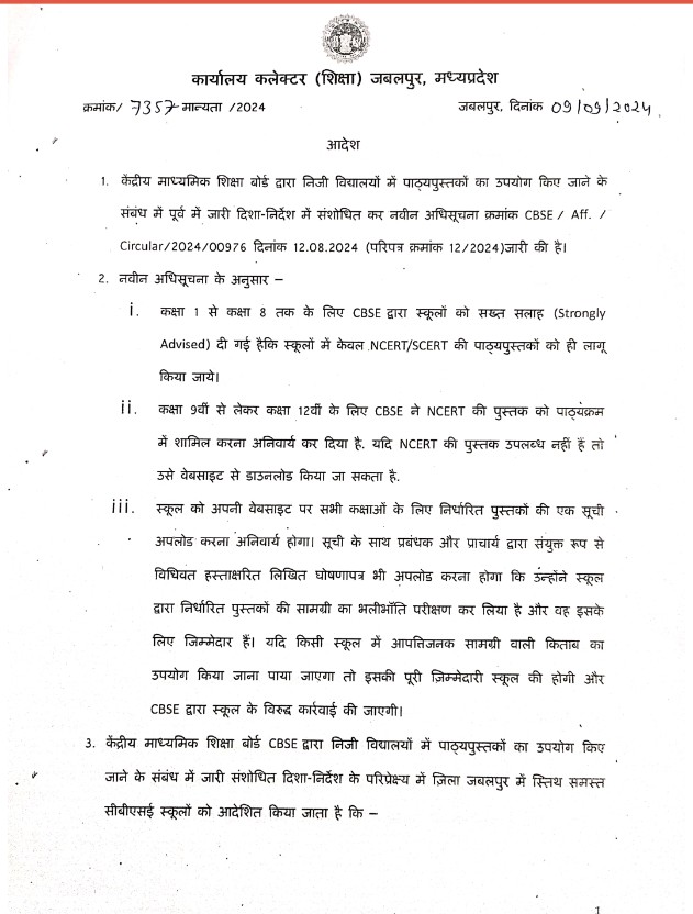 जबलपुर कलेक्टर ने सीबीएसई स्कूलों को दिया आदेश: कक्षा एक से आठ तक एनसीईआरटी की किताबों का ही करें उपयोग