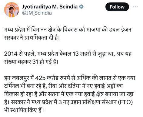वहीं केन्द्रीय मंत्री ज्योतिरादित्य सिंधिया ने ट्वीट कर कहा कि प्रदेश में डबल इंजन की सरकार लगातार विकास कर रही है। जल्द ही अनेक शहरों को हवाई अड्डों से जोड़ा जाएगा इसके लिए जबलपुर में नया टर्मिनल भी बना रहे है।