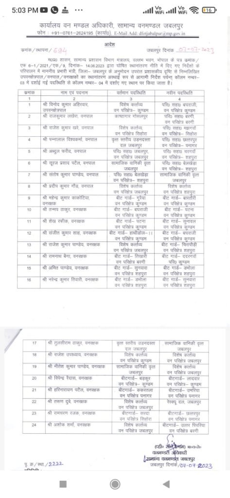 जबलपुर, यशभारत। मध्य प्रदेश शासन सामान्य प्रशासन विभाग मंत्रालय, वल्लभ भवन भोपाल के घोषित स्थानांतरण नीति में दिए गए निर्देशों के परिपालन में संचालक, उपवन क्षेत्रपाल, वनपाल और वनरक्षकों की स्थानांतरण लिस्ट जारी कर दी गई। सचिन सरावगी लेखापाल, संचालक राज्य वन अनुसंधान संस्थान की नवीन पदस्थापना वन संरक्षक, मध्य वनवृत्त जबलपुर सहित 30 कर्मियों और अधिकारियों की नवीन पदस्थापना जिले